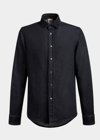 In navy blue cotton denim, this long-sleeve shirt from the Adrien Brody Travel Collection is designed for casual, effortless sophistication and comfort. Buttons fasten the front and adjust the fit of the cuffs.