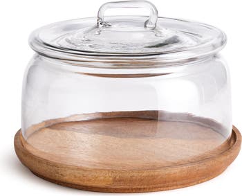 With a classic shape and simple handle, this cloche houses cheese, pastries or rolls. Sitting atop a natural wood board, it makes for easy entertaining.