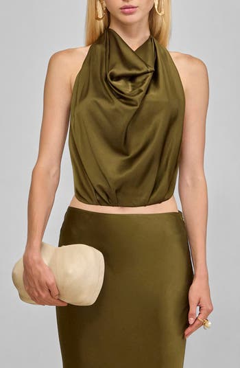 Stretch-kissed silk aids the devastating drape of a night-out halter top.