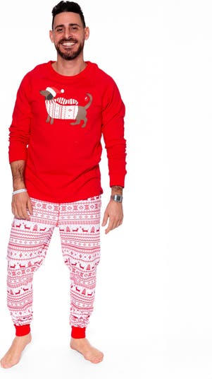 Make this Christmas morning your most stylish one yet with this adult sleepwear set in a festive red and white fairisle print. Designed to match coordinating PJs for moms, babies, and kids, these adult men pajamas feature a solid long sleeve tee with a reindeer print on the chest and allover print pants with a soft and stretchy elastic waistband that makes them ultra-comfortable to wear.