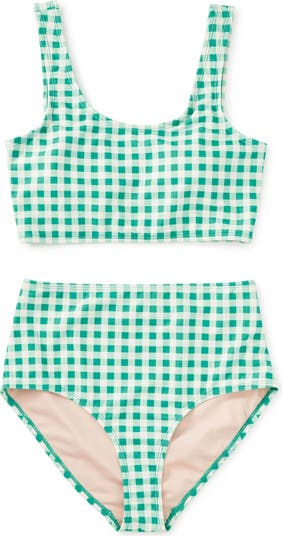 A returning favorite, back by popular demand. This adult two-piece swimsuit offers a confident, flattering fit with thoughtful details designed for long days by the water. Fully lined for comfort and coverage, the top features a low back silhouette with removable padded inserts for customizable support, while the high-rise bottoms provide a secure feel with full coverage through the back. Crafted with UPF 50+ sun protection and made from recycled materials, it's a reliable swim staple that balances comfort, function, and timeless style. Follow our care instructions to help keep it looking its best swim after swim.