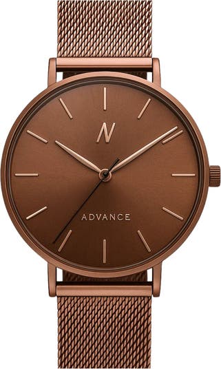 - Miyota quartz movement Case size: 36mm Stainless steel case and milanese mesh bracelet Mineral-hardlex crystal Water resistance: 3 ATM Dial color: Muted Mocha/Rose Gold Bracelet finish: Muted Mocha Mesh Strap With Clasp Limited production Manufacturer’s 60-month warranty
