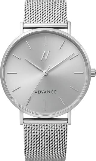 A stainless steel milanese mesh watch featuring a miyota quartz movement, mineral-hardlex crystal, and a beveled 36mm case dial and design.