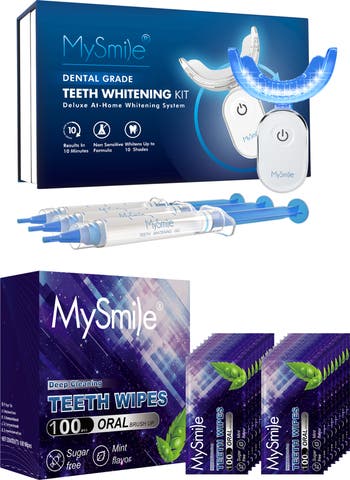MySmile Advanced Kit uses a 28‑LED blue light and vegan gel to whiten in 10 minutes, FDA approved and gentle for sensitive teeth, includes 200 teeth wipes.
