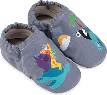 Friendly charaters adorn the toe of this pull-on bootie that offers a barefoot feel via a wide toe box and flexible design perfect for growing feet.