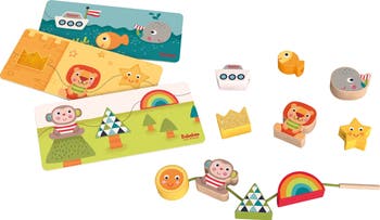Sort, stack, and thread! This interactive early learning toy combines storytelling, fine motor development, and open-ended creativity. Children can follow illustrated story cards or create their own designs as they thread colorful wooden blocks onto the cord. The Adventure Threading Game promotes concentration, dexterity, sequencing, and spatial reasoning, making it ideal for early childhood development. Montessori-inspired play encourages hands-on learning, pattern recognition, and imaginative storytelling. A PlayTales™ card is included, featuring a unique story and matching activities written by a children’s author just for this product. Designed in Europe, the Bababoo and friends® Adventure Threading Game is crafted from high-quality materials for lasting, meaningful play.