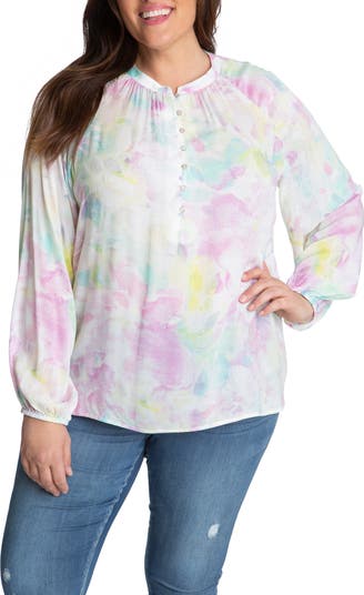 This airy long-sleeve blouse with elastic cuffs is punctuated by pearlescent buttons at the chest.