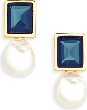 Dream of wine-dark seas and bright-white beaches when you wear these Grecian-inspired drop earrings adorned with bezel-set square crystals and glossy faux pearls.