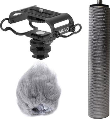 Increase the use and adaptability of your Zoom or other branded digital recorder with this all-purpose accessory kit. Contains artificial-fur windscreen, shock mount, camera shoe and padded aluminum hand grip. The AEK-Z4 Audio Enhancement Kit lets you take your recording to the next level. Expand the usefulness of your digital recorder with the addition of these essential accessories: -The artificial-fur windscreen seals your sensitive mic head from wind and obtrusive background noise while still maximizing the sensitivity and audio pick up. The air-tight rubber seal ensures the windscreen provides 360 degree wind protection. -The shock mount uses a rigid 4-point suspension to keep your recorder steady and secure, whether it's mounted on your camera, boom pole or other rig. - The padded aluminum hand grip provides and easy, secure way to bring your recorder in close to the subject. The dense foam padding ensures for a comfortable grip, and the aluminium build ensures a solid connection.