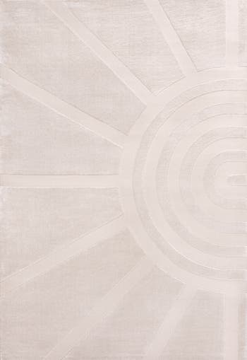 This casual rug features an abstract sun design and a crisp two-tone color scheme. Inspired by midcentury modern styles, it's woven from p polyester, in a high-low pile that accentuates the pattern. Make a bold statement in the bedroom, living room or dining room with this geometric rug. Please note that variations in the rug's appearance may occur when the fibers are brushed due to natural light reflection and weaving characteristics.