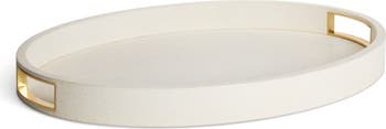Stingray-embossed leather lends elegant, modern texture to a stylish cocktail tray designed with gleaming brass handles.