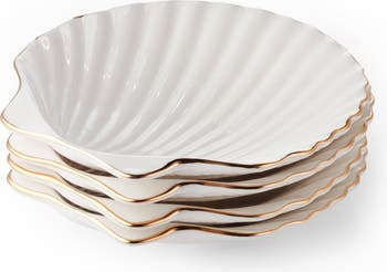 Gold edging enhances a set of four shell-shaped appetizer plates.