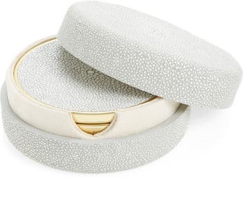 Stingray-embossed leather lends elegant, modern texture to a quartet of coasters that come in their own convenient lidded holder.