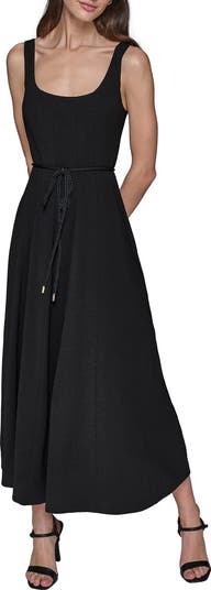 A ropy belt cinches the waist of a full-skirted dress topped with a romantically squared neckline for a look that's easy to style up or down.
