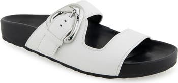 A polished buckle adds elegant shine to this flat sandal set on a cushioned footbed and flexible outsole to keep you moving effortlessly all day long.