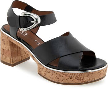 Crisscrossing straps enhance the breezy appeal of a chunky block-heel sandal boosted by a cork- or raffia-wrapped platform and flexible grip sole.