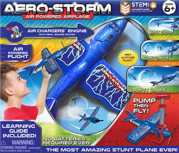 AERO-STORM AIRPLANE - ACROBATIC FLIGHT - BLUE - New and improved design from the developers of Air Hogs. The Aero-Storm Airplane will wow and amaze you every acrobatic flight! The most amazing stunt plane ever with real engine sounds! Super easy to launch! Just pump it up, toss, and watch as Aero-Storm performs corkscrews, loopty loops, bank turns, and more! Features a patented self-starting micro air-engine that requires no batteries ever! Built to withstand the rigors of adventurous flying, the Aero-Storm is made from high-quality, impact-resistant materials. It can handle crash landings and rough play without any damage, ensuring endless fun. Perfect flying airplane toy for kids or adults! INCLUDES: Airplane, air pump, & instruction manual.