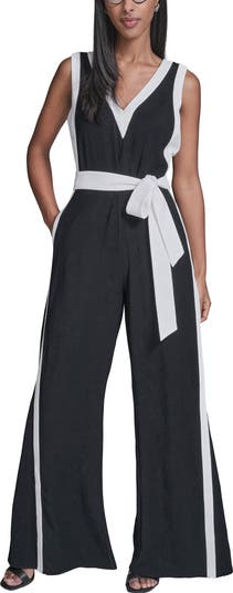 A drapey sash tethers the waist of this sleeveless jumpsuit made with contrasting trim and finished with drapey wide legs.