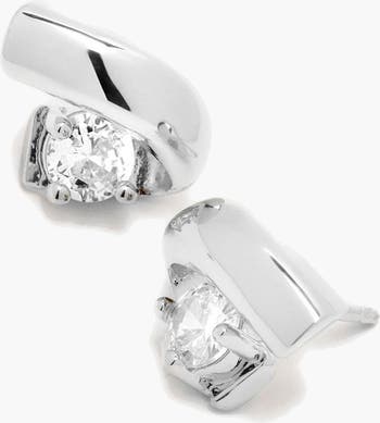 Clean lines meet subtle brilliance. The Sculpted Crystal Studs feature a smooth, curved silhouette that wraps gently around a single faceted stone creating a modern, refined contrast between metal and light. Designed in a high-polish silver finish, the sculptural form catches reflections from every angle, while the inset crystal adds a soft, elevated sparkle. Minimal yet distinctive, they sit close to the lobe for an effortless, everyday statement.