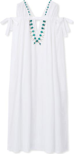 The Afef dress is a celebration of warm climates and tropical getaways. Made from light cotton, it’s designed to keep you cool and comfortable. Its flowing shape moves gracefully as you enjoy the sea breeze. The open back adds a touch of allure, while the deep V-neck, adorned with turquoise stones and hand-applied silver, captures the essence of exotic beauty. With this dress, you’ll be ready for a summer adventure, crafted in Italy by Fortela .
