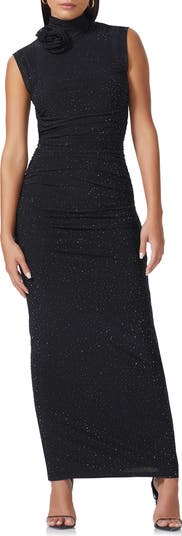 A rosette sits at the neckline of this sparkly rhinestone-embellished maxi dress cut in a curve-hugging silhouette with a bold cutout at the back.