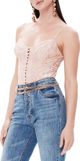 Alluringly gapped buttons add to the mystique of this mesh and lace thong bodysuit styled with a triangle theme that flatters as it flirts.
