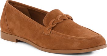A braided saddle adds subtle dimension to a streamlined loafer shaped from supple suede and featuring a slender apron toe.