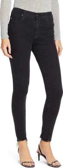 Frayed hems and a faded-black wash bring lived-in appeal to high-waist jeans in a streamlined, ankle-grazing silhouette.
