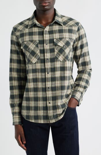 Channel classic Americana style with this rugged Western shirt featuring pearly snaps, bias-cut chest pockets and a yarn-dyed plaid pattern.