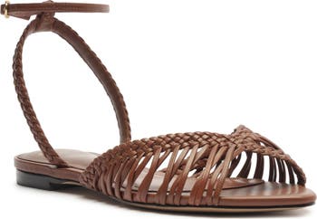 This ankle-strap sandal is handcrafted using over 30 meters of leather strings to create the intricate weaving that showcases the label's artisanal elegance.