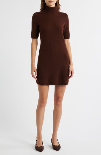 Soft cashmere adds a luxe look and feel to this leggy-length sweater-dress knit with abbreviated sleeves and a cozy turtleneck.