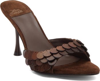 Beaded detail adds alluring texture to the curvaceous strap of this suede slide sandal elevated by a steep stiletto heel.
