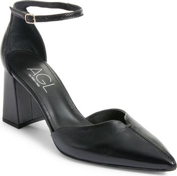 A rich leather finish and d'Orsay-inspired silhouette lend modern elements to a pointy-toe pump lofted by an architectural block heel.