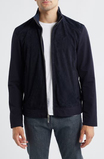 A velvety lambskin-suede front panel makes a polished initial impression in this performance-minded stretch-nylon jacket featuring a double-knit lining for the stand collar and the brand's signature savvy magnetic-closure pockets.