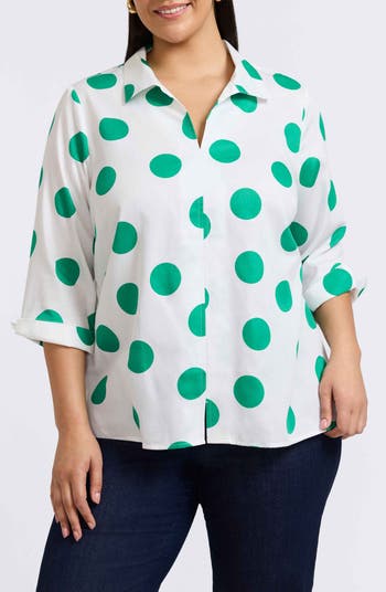 Exploded-scale polka dots animate this easygoing popover top cut from crisp cotton poplin and framed with three-quarter sleeves.