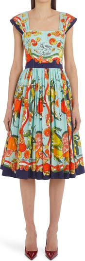 The sweet citrus scent of an Italian summer is vibrantly celebrated by a cotton-poplin dress shaped with a corset bodice, a smocked back and a twirlable skirt.