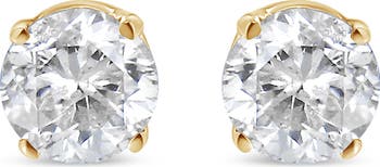 Celebrate any occasion with these classic shimmering diamond stud earrings. Crafted from 14k Yellow Gold each earring showcases a sparkling Brilliant Round-Cut Solitaire Diamond in a 4-Prong Setting. Dazzling with 3/8 cttw of diamonds and a bright polished shine, these Push Back stud earrings secure comfortably on your ear. These diamond studs are certified by the AGS as natural, earth mined diamonds. These diamonds are color rated as L-M Color, and clarity graded as SI1-I1 Clarity . Make these classic diamond studs yours today. Comes as a pair. Each earring piece has a 1/5 cttw diamond and the total weight for this diamond stud pair is 3/8 cttw.
