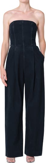 Show off your shoulders in this dark-wash denim jumpsuit made with pronounced topstitching and finished with leg-elongating wide hems.
