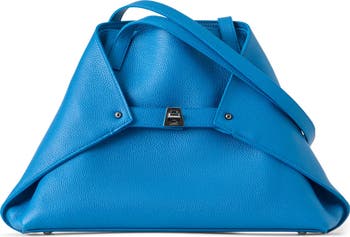 Clean, architectural lines define this vibrantly hued calfskin-leather tote with a minimalist design that quickly converts for multiple tailored looks. Carry as a classic shopper or cinch it using the inventive turnlock tabs to create a streamlined trapezoidal silhouette, a hallmark of the Akris fashion house.