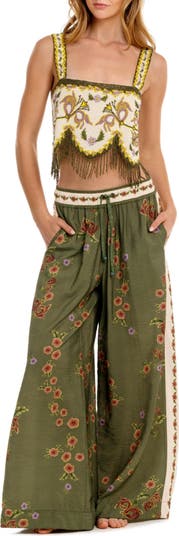 Intricate hand-sewn beadwork covers the breathable cotton fabric of this boho cover-up top featuring delicate fringe trim.