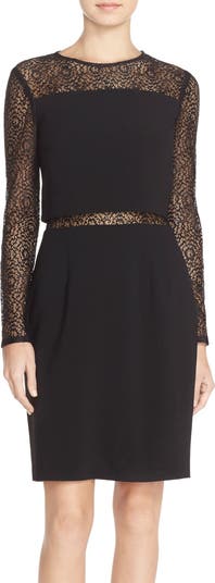 A modern popover tier offers a tasteful glimpse of midriff while balancing the romantic illusion-lace panels of this little black dress.
