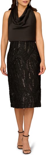 A satin bodice contrasts the lustrous sequined skirt on this dress made in a figure-skimming silhouette and finished with an airy slit for easy movement.