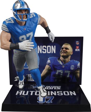 Aidan Hutchinson was selected as the second overall pick in the 2022 NFL draft by the Detroit Lions. He was named to the All-Rookie Team in 2022 and voted to his first Pro Bowl in 2023. McFarlane's SportsPicks NFL Legacy Series Figure #15. Officially licensed by the NFL and NFLPA. Incredibly detailed 7" scale posed figure. Includes a backdrop. Comes with a base with team logo insert.