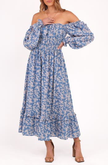 A softly smocked bodice gives this floral midi dress its easy fit, while balloon sleeves can slip off the shoulder for a romantic touch.