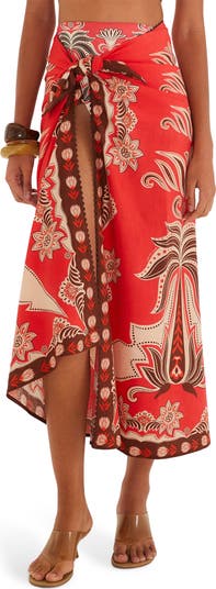 Perfect for sunny beach days, this fluttering skirt in a rich red hue adorned with floral patterns celebrates nature's beauty.