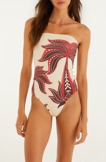 Embrace the salty breeze as you lounge along the shore in this strapless one-piece swimsuit cut with high legs.
