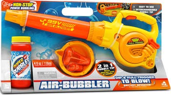 AIR BUBBLER - Bring on the bubbly fun with the amazing Air Bubbler! The Air Bubbler is a great battery-operated bubble blower to allow your youngsters to play and experiment. Designed for easy use and endless entertainment, it lets your little ones discover how different wands create different bubble sizes—all with the push of a button! It’s the perfect way to turn any playtime into a bubble-filled adventure that will keep them entertained for hours. INTERCHANGEABLE TIPS: There are three exciting ways to play! Use the big tip to create large bubbles, the small bubble tip for a flurry of tiny bubbles, or both tips together to make a magical mix of bubble sizes swirling through the air. The variety keeps the fun fresh, encouraging kids to explore and imagine as they watch bubbles dance around them. Blows endless bubbles! Simply fill the cup with bubble solution, tip the Air Bubbler's tip in the solution, and press the button! The Air Bubbler comes complete with a 4-ounce bottle of bubble solution, so playtime can start right away. Requires two “AA” / LR6 batteries (not included). Ages 3 and up.