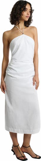 - Ruched through the bodice, this dress perfectly skims the figure before falling into a draped midi skirt. It’s made from a blend of linen and Tencel, which feels airy against the skin, and features halter ties adorned with Onia-engraved hardware.