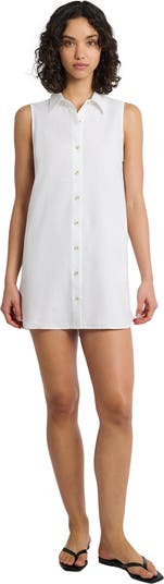 The Air Linen Sleeveless Shirtdress falls to a mini length.