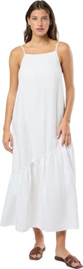 - Featuring a high square neckline, framed by adjustable straps, this dress is draped in a linen-Lyocell blend and falls to a maxi length. A gathered bias-cut seams details the skirt’s bottom half.